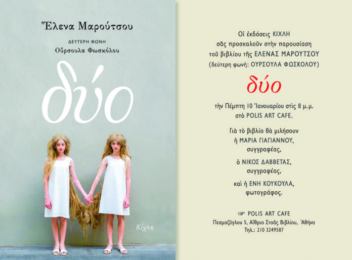 Οι εκδόσεις ΚΙΧΛΗ σας προσκαλούν στην παρουσίαση του βιβλίου της ΕΛΕΝΑΣ ΜΑΡΟΥΤΣΟΥ (δεύτερη φωνή: ΟΥΡΣΟΥΛΑ ΦΩΣΚΟΛΟΥ) «δύο» την Πέμπτη 10 Ιανουαρίου στις 8 μ. μ. στο POLIS ART CAFE.