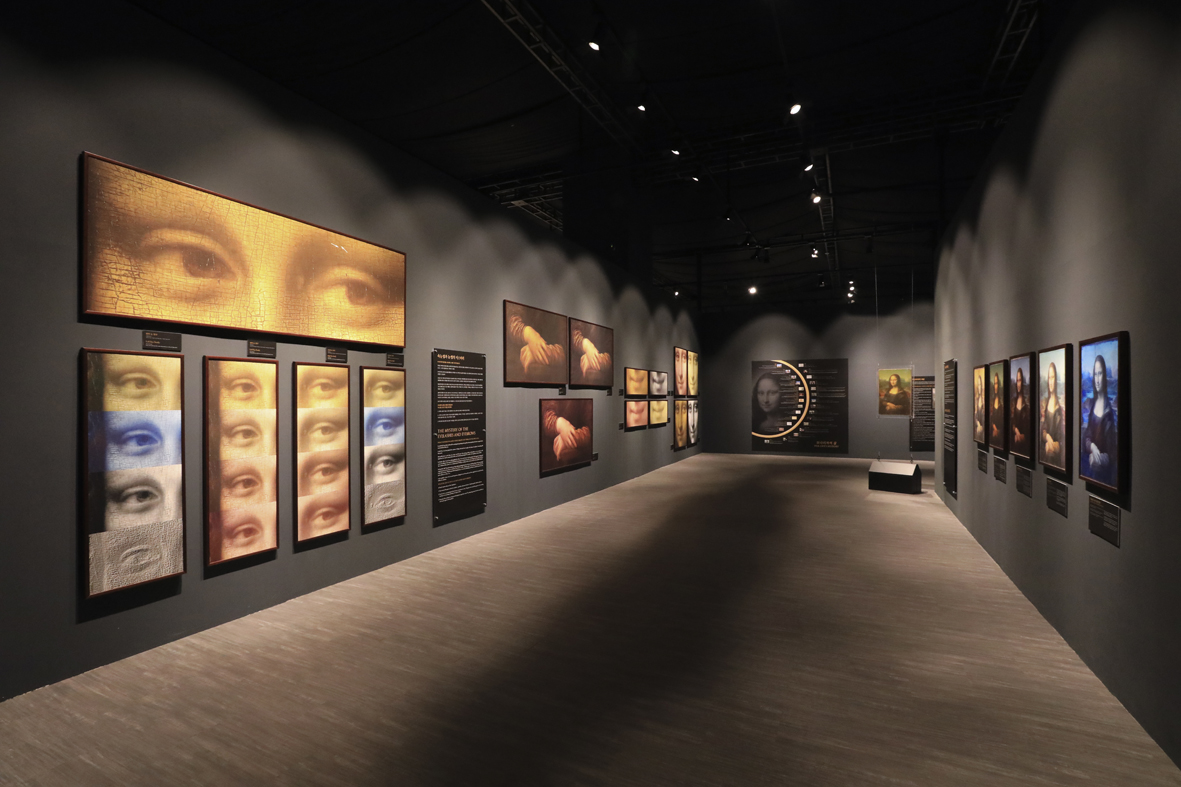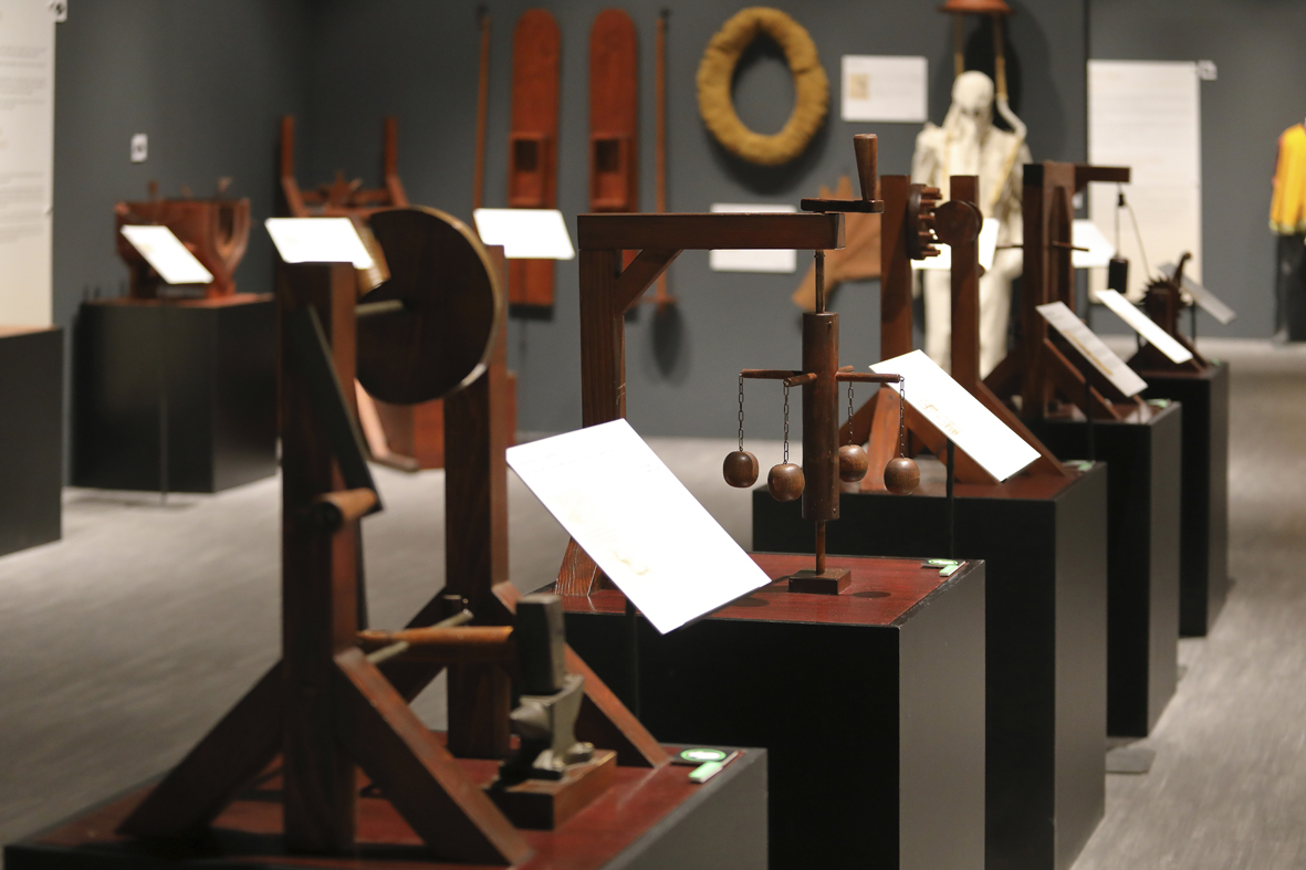 75 μοντέλα των εφευρέσεών του, αναπαραγωγές σε φυσικό μέγεθος, διαδραστικές μηχανές, αντίγραφα των περίφημων κωδίκων του και συνολικά πάνω από 200 εκθέματα σχεδιασμένα σε συνεργασία με το Μουσείο Leonardo da Vinci της Ρώμης.